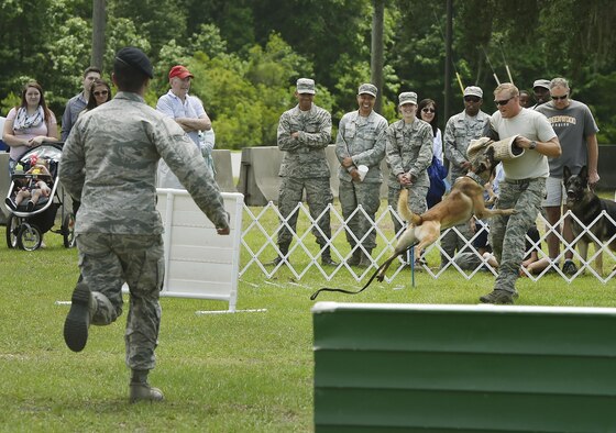 U.S. Air Force Senior Airman Trey Weston, 628th Security Forces Squadron military working dog handler, and Ari, MWD, greet a crowd after performing a demonstration during a base picnic at the Air Base Picnic Grounds May 5, 2017, at Joint Base Charleston, S.C. Attendees were provided free meals and were able to participate in various activities including face painting, wall rock climbing, live music and a Military Working Dog demonstration.
