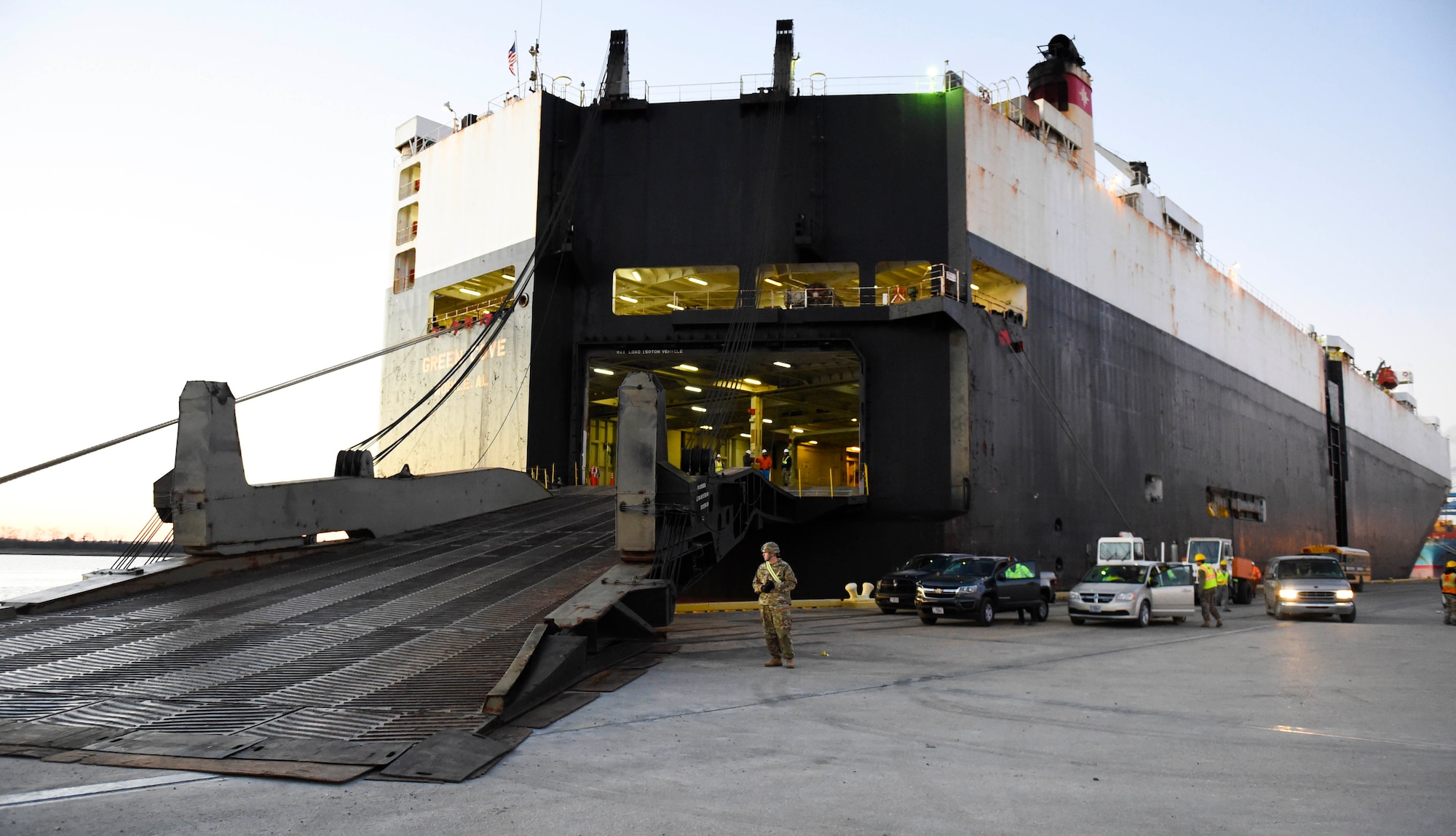 U.S. Army personnel assigned to the 841st Transportation Battalion on-loaded vehicles and equipment for deployment Jan. 11, 2019, at Wharf Alpha on Joint Base Charleston, S.C. in continuing support of Atlantic Resolve. Equipment from the 1st Infantry Division at Fort Riley, Kansas, was transported onboard a vehicle carrier with a gross tonnage of 57,000.