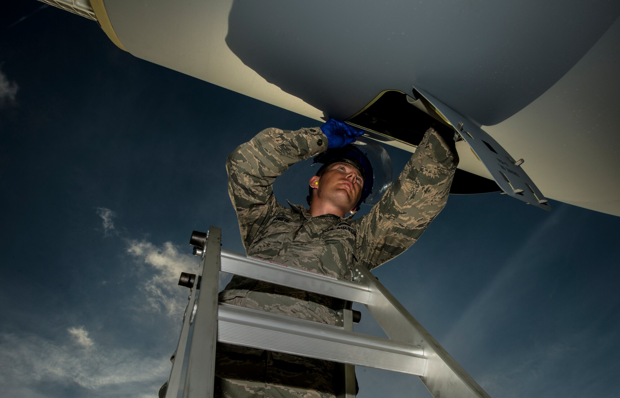 Senior Airman Jay O’Neil, and Airman 1st Class Matthew Taresh, 437th Aircraft Maintenance Squadron crew chiefs, perform the first recovery and maintenance checks on a new C-17 Globemaster III delivered May 30, 2013, to Joint Base Charleston – Air Base, S.C. The C-17 was piloted by Lt. Gen. Robert Allardice, Air Mobility Command vice commander. Joint Base Charleston is scheduled to receive the final C-17 later this year, as Boeing completes work on the Air Force’s last Globemaster. The first C-17 to enter the Air Force’s inventory arrived at Charleston Air Force Base in June 1993. The C-17 is capable of rapid strategic delivery of troops and all types of cargo to main operating bases or directly to forward bases in the deployment area. (U.S. Air Force photo/Senior Airman Dennis Sloan)