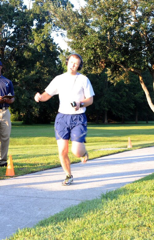 First Lieutenent Ryan Peake finishes first in the Commander's Fitness Challenge, Sept. 1, at Joint Base Charleston, S.C. Peake ran the challenge in 17:27 and is assigned to the 628th Family Support Squadron. (U.S. Air Force photo/Airman 1st Class Ashlee Galloway)