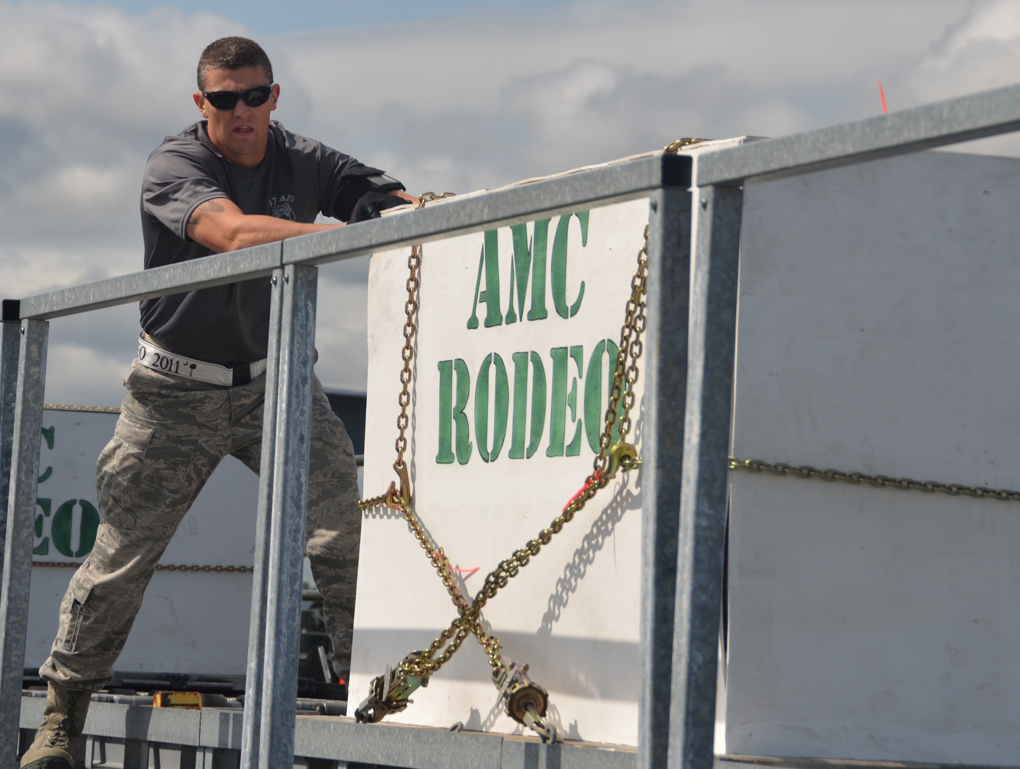 Team Charleston Rodeo member Senior Airman Marvin Richardson directs Staff Sgt. Ashley Kelly the K-loader operator, to align the Halvorsen loader with the high-line dock, a simulated aircraft ramp, during the 25K loader obstacle course July 27 at Joint Base Lewis-McChord, Wash. (U.S. Air Force photo/2nd Lt. Susan Carlson)