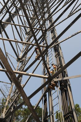 Senior Airman Matthew Baldyga and Staff Sgt. John Kinglsey climb the radio frequency tower during a training exercise at Joint Base Charleston - Weapons Station June 14. Sergeant Kingsley is a radio frequency transmissions craftsman and Airman Baldyga is a radio frequency transmissions journeyman assigned to the 628th Communications Squadron. (U.S. Air Force photo/Staff Sgt. Katie Gieratz)