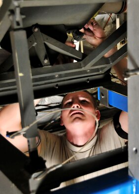 Staff Sgt. Jessy Martin (left) hands a wrench to Airman 1st Class Eric Duncan, to remove a 46-person life raft from a C-17 April 25, on Joint Base Charleston - Air Base. Sergeant Martin and Airman Duncan are crew chiefs from the 437th Aircraft Maintenance Squadron. (U.S. Air Force photo by /Airman 1st Class Jared Trimarchi) (Photo by Airman st Class Jared Trimarchi)