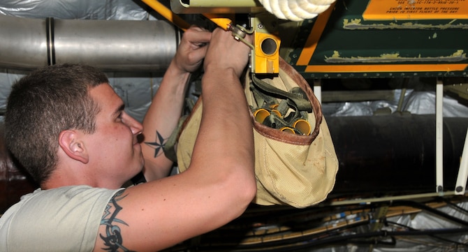 Airman 1st Class Eric Duncan removes a safety pin attached to a 46-person life raft stored on the roof of a C-17 April 25, on Joint Base Charleston - Air Base. The life rafts must be replaced every three years and take approximately two hours to replace. Airman Duncan is a crew chief from the 437th Aircraft Maintenance Squadron. (U.S. Air Force photo by /Airman 1st Class Jared Trimarchi) (Photo by Airman st Class Jared Trimarchi)
