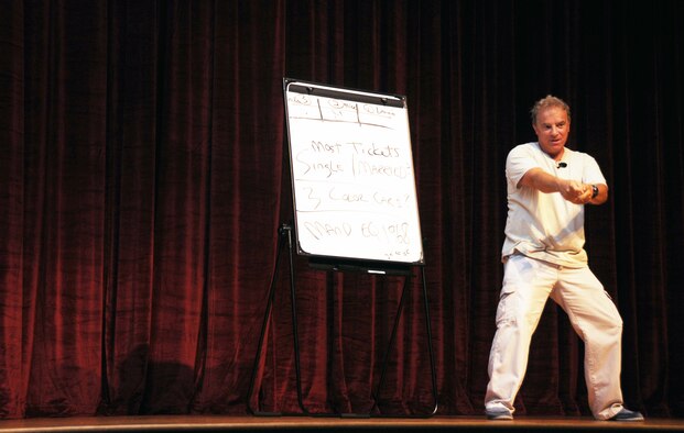 Comedian Steve Verret tallies up points for audience participation during his stand-up routine Aug. 26, 2010, on Joint Base Charleston, S.C. Mr. Verret engaged the audience with his Cajun flair and comedic talent, pitting sections of the audience against each other to vie for points on driving trivia and enthusiasm. Mr. Verret's routine fused his experience as a traffic safety instructor with stand-up comedy to educate Team Charleston on the simple yet statistically effective habits of safe driving. (U.S. Air Force photo/Airman 1st Class Ian Hoachlander)