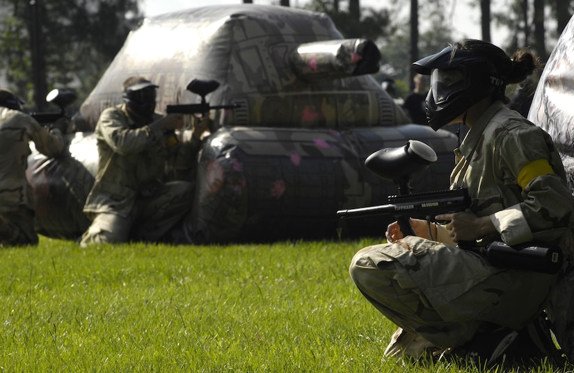 An Airman in the Commander's Fitness Challenge paintball tournament takes aim and fires across the base picnic grounds June 4, 2010, at Joint Base Charleston, S.C. Squadrons represented at the event included the 628th Security Forces, Logistics Readiness, Comptroller, Force Support and 437th Maintenance Squadrons as well as the 437th Operations Group. (U.S. Air Force photo/Airman 1st Class Lauren Main)