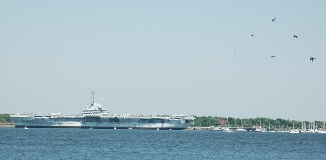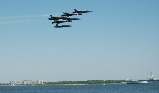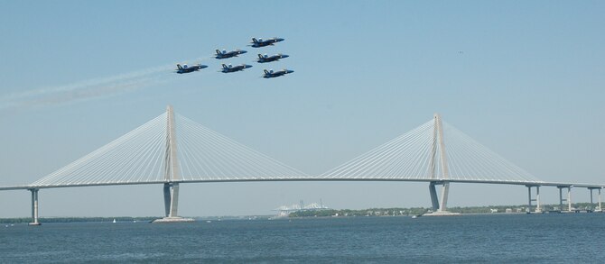 The world famous Blue Angels performed April 17 and 18 over Charleston Harbor in Charleston, S.C., as thousands of people lined the waterfront and viewed from rooftops. The team of six F/A-18 Hornets and a C-130 nicknamed "Fat Albert" performed on a sunsoaked weekend with the USS Yorktown and the Arthur Ravenel Jr. Bridge as a backdrop.