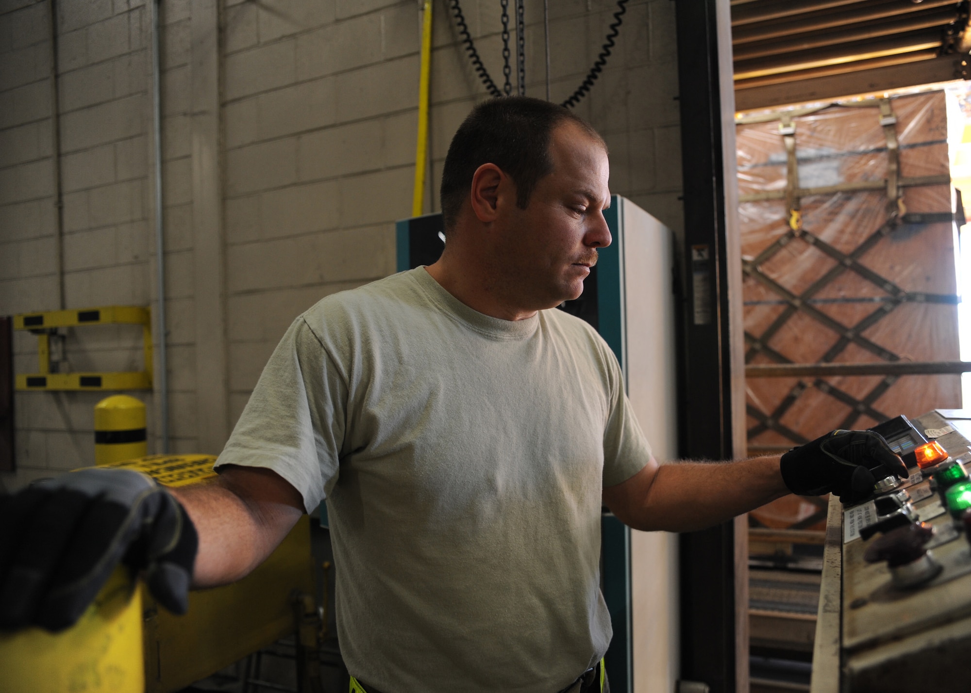 U.S. Air Force Senior Airman Jason Ray, from the 437th Aerial Port Squadron, positions a pallet of water for easy loading at Charleston Air Force Base, S.C, Jan. 17, 2010, during Haiti earthquake relief efforts. 56 pallets of water have been built and will be flown aboard a C-17 Globemaster III aircraft to aid in the relief effort after an earthquake struck Haiti Jan. 12, 2010. Charleston Air Force Base is a component of Air Mobility Command, which has delivered more than 323 tons of emergency cargo to Haiti since relief operations began Jan. 13, 2010. (U.S. Air Force photo by Senior Airman Amber Grimm/Released)