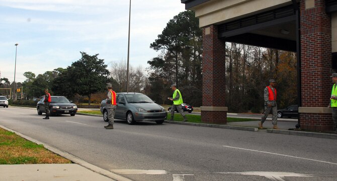 Charleston AFB Airmen exit the base through the Dorchester Road main gate here for the start of a four-day holiday weekend Dec. 23. The 437th Airlift Wing Safety Office hosted a safety send-off event at the Dorchester Road gate, Rivers Avenue gate and the Gaylor Dining Facility to stress the importance of safe driving habits and responsible alcohol use during holiday festivities. (U.S. Air Force photo/Staff Sgt. Daniel Bowles)