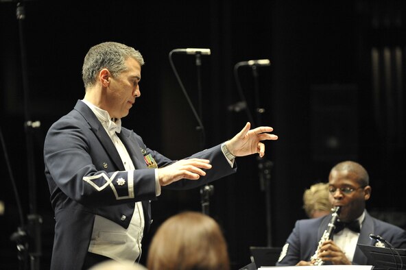 U.S. Air Force Lt. Col. Douglas Monroe conducts the U.S. Air Force Heritage of America Band at the North Charleston Performing Arts Center in North Charleston, S.C., Dec. 9, 2009. For more than half a century, the band has represented the Air Force with musical and military distinction. Colonel Monroe is the commander and conductor for the Heritage band. (U.S. Air Force photo by James M. Bowman)(Released) (Photo by James M. BowmanReleased)