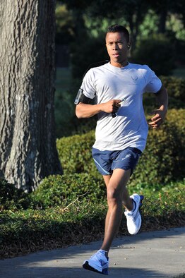 Senior Airman Terrell Pretlow finishes first for the men in the Commander's 5K Run/Walk Challenge held here Nov. 6 with a time of 18:45. A fitness challenge is conducted the first Friday of each month at Charleston AFB, promoting a base-wide fitness culture. Airman Pretlow is a utilities technician with the 437th Civil Engineer Squadron. (U.S. Air Force photo/James Bowman)