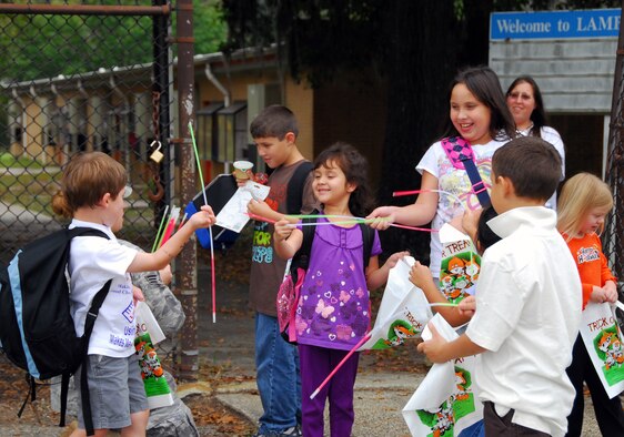 Master Sgt. Erwin Arguilla gives Alex Serrano a colorful trick-or-treat bag at the Lamb's Elementary School gate here Oct. 30. Members of the 437th Airlift Wing Safety Office provided students passing through both the Lamb's and Hunley Park Elementary School gates free bags for collecting Halloween candy and reminded each to have a safe Halloween. Sergeant Arguilla is the 437 AW Safety Office ground safety superintendent and Alex is the son of Staff Sgt. Kevin Serrano who is with the 437th Logistics Readiness Squadron. (U.S. Air Force photo/Staff Sgt. Daniel Bowles)