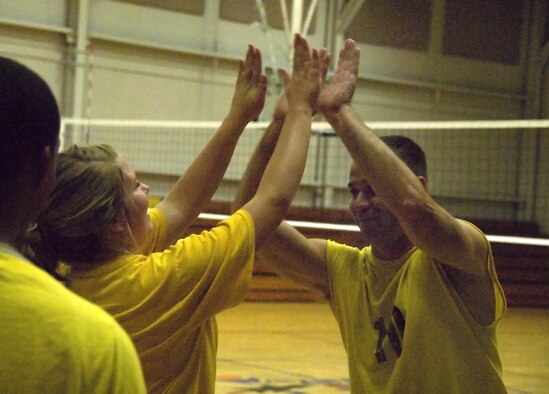 Brittany Thomforde and Robert Charest celebrate after winning the second match of the Charleston AFB intramural volleyball championship game at the Fitness and Sports Center here Oct. 22. After a difficult first match versus the 437th Operations Group/Operations Support Squadron Flyers, losing 14-25, the 437th Aerial Port Squadron positioned themselves for a comeback in the second match winning 25-21. Thomforde is a traffic management apprentice and Charest is a unit security manager, both are with the 437 APS. (U.S. Air Force photo/Staff Sgt. Daniel Bowles)