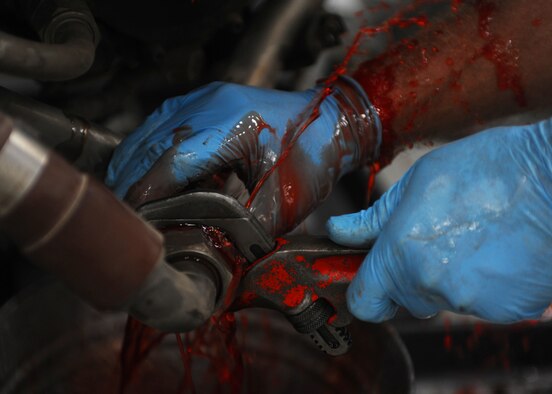 Corey Seeber disconnects the hydraulic lines from the hydraulic pumps on a C-17 engine on Charleston AFB, June 22. The pumps and lines are disconnected so that inspectors can check each piece separately. Mr. Seeber is an aviation maintenance technician with United Airlines. (U.S. Air Force Photo/Senior Airman Katie Gieratz)