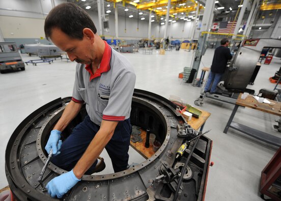 Jerry Zuk repairs a thrust reverser here June 18. Thrust reversers are disassembled into separate pieces and every piece is inspected and repaired before being put back together. The all-civilian engine shop installs, inspects and repairs five to six engines a month. Mr. Zuk is an aviation maintenance technician with United Airlines. (U.S. Air Force photo/Senior Airman Katie Gieratz)
