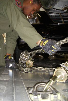 Senior Airman Alfonso Rogers secures vehicles from Vice President Joe Biden's motocade inside a C-17 May 27 at Peterson AFB, Colo. Vice President Biden presented the commencement address during the U.S. Air Force Academy's 51st graduation ceremony. Airman Rogers is a loadmaster with the 15th Airlift Squadron. (U.S. Air Force Photo/Senior Airman Stephen Collier)