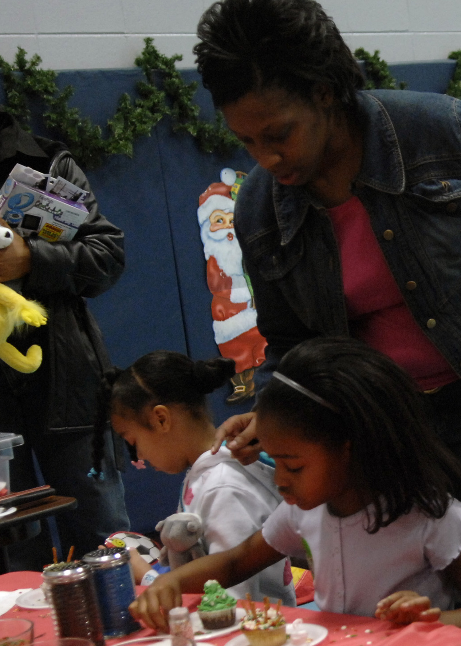 Anita Williams helps daughter Kanisha Porter decorate cupcakes at the annual holiday party on Charleston AFB Dec. 13. Youth Programs hosts the annual holiday party where base youth have the opportunity to meet Santa Claus, get their faces painted along with various other activities.Kanisha is the daughter of Ms. Williams and Tech. Sgt. Eugene Porter with the 437th Aerial Port Squadron. (U.S. Air Force photo/Airman 1st Class Katie Gieratz)