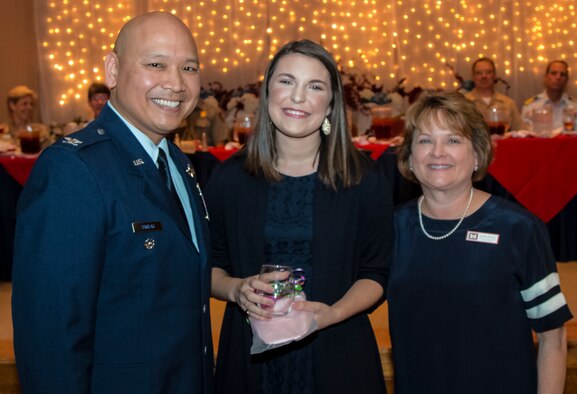 Col. Jimmy Canlas, vice commander, 437th Airlift Wing, Joint Base Charleston (left) and Glenn Jeffries, corporate communications officer, U.S. Army Corps of Engineers (right), thank Katie Stagliano, founder, Katie's Krops, for being the guest speaker at the Federal Executive Association's Annual Federal Employee of the Year Luncheon. The luncheon, held at the Red Bank Club, JB Charleston – Weapons Station, recognizes federal employees who go above and beyond their normal duties. Stagliano spoke about her non-profit company which advocates growing gardens and donating the produce to food banks to use for their meals. (U.S. Army Corps of Engineers photo/Sara Corbett)
