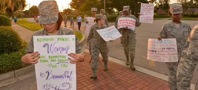 Joint Base Charleston Airmen march together for national Women’s Equality Day at JB Charleston, SC, Aug. 26, 2015. Women’s Equality Day began in 1972, where it was originally called Women’s Rights Day. (U.S. Air Force photo/Airman 1st Class Thomas T. Charlton)