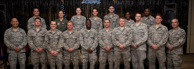 Col. Jimmy Canlas, 437th Airlift Wing vice commander (left) and Chief Master Sgt. Kristopher Berg, 437th AW command chief (right), stand with staff sergeant selects from the 437th AW Aug. 20, 2015, at the Charleston Club on Joint Base Charleston, S.C. The purpose of the event was to highlight the achievement, acknowledge the selectees and give them an opportunity to celebrate and socialize with other selectees, friends and family. (U.S. Air Force photo/Airman 1st Class Clayton Cupit)