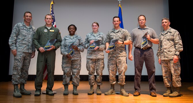 Col. John Lamontagne, 437th Airlift Wing commander, and CMSgt Shawn Hughes, 437th AW command chief, congratulate the award winners of the 437th AW 1st Quarterly Awards April 30, 2015, at the base theater on Joint Base Charleston, S.C. The Quarterly Awards are held to recognize outstanding Airmen, non-commissioned officers, senior non-commissioned officers, company grade officers and civilians for their hard work and dedication. The winners displayed are (left to right) Senior Master Sgt. Chad Neubarth, SNCO of the Quarter, Tech. Sgt. Danaly Holder, NCO of the Quarter, Airman 1st Class Brandilyn Grant, Airman of the Quarter, 1st Lt. David Snyder, CGO of the Quarter and Mr. James Moore, Civ Cat II of the Quarter. (U.S. Air Force photo/ Airman 1st Class Clayton Cupit)