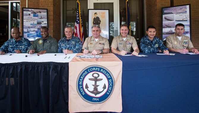 From left to right, Lieutenant Commander Samuel Crum, Naval Health Clinic Charleston Comptroller; Cmdr. Steven Jones, Navy Operational Support Center Charleston commanding officer; Capt. Charles Phillip, Naval Munitions Command Unit Charleston commanding officer; Capt. Timothy Sparks, Joint Base Charleston deputy commander; Capt. John Fahs, Naval Nuclear Power Training Command commanding officer; Cmdr. Baldomero Garcia, SPAWAR Systems Center Atlantic Engineering Military deputy; and GSCS William Schmelling, Naval Consolidated Brig Charleston Prisoner Management, sign the Navy Marine Corps Relief Society Fund Drive March 5, 2015, at Storme Point on Joint Base Charleston - Weapons Station. All donations made to the NMCRS are used to assist any Sailors or Marines with personal financial emergencies. The drive is held through March 31, 2015. To donate call (843) 794-8218 or send an email to adrian.jones.10@us.af.mil (U.S. Air Force photo/ Senior Airman Dennis Sloan)
