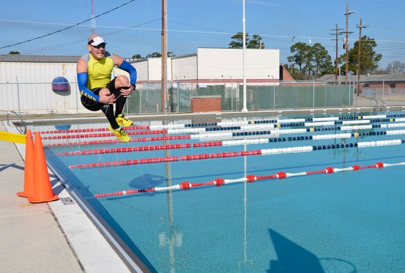 The lead participant cannonballs into the New Wave Aquatic Center pool at Sam's Fitness Center on Joint Base Charleston-Weapons Station, Feb. 21, 2015 after completing the 5K run. Approximately 20 participants came out for the inaugural 5K Fun Run and Polar Plunge event and braved the chilly temps of the water after a run through base housing. (Courtesy photo/Jessica Donnelly