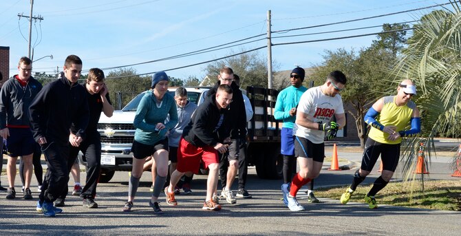 Participants prepare to start the run portion of the inaugural 5K Fun Run and Polar Plunge hosted by Sam's Fitness Center on Joint Base Charleston-Weapons Station, Feb. 21, Following the run, participants then had to swim across the New Wave Aquatic Center pool at Sam's Fitness Center. The temperature for the day was in the low to mid 60s. (Courtesy photo/ Jessica Donnelly)