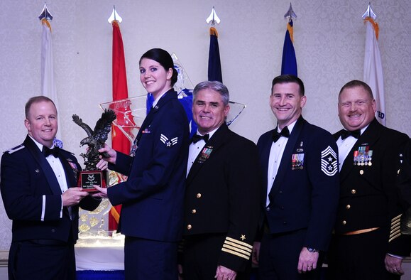 Col. Jeffrey DeVore, Joint Base Charleston commander, Capt. Timothy Sparks, JB Charleston deputy commander, Master Chief Petty Officer Joseph Gardner, Naval Support Activity command master chief and Chief Master Sgt. Mark Bronson, 628th Air Base Wing command chief present Senior Airman Erin Winkler, 437th Aircraft Maintenance Squadron, with the Honor Guard Member of the Year award Jan. 23, 2015, at the 2014 628th ABW Annual Awards Banquet at the Charleston Club on Joint Base Charleston, S.C. (U.S. Air Force photo/Airman 1st Class Clayton Cupit)