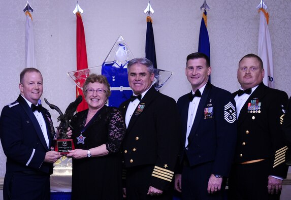 Col. Jeffrey DeVore, Joint Base Charleston commander, Capt. Timothy Sparks, JB Charleston deputy commander, Master Chief Petty Officer Joseph Gardner, Naval Support Activity command master chief and Chief Master Sgt. Mark Bronson, 628th Air Base Wing command chief present Ms. Catherine Hallett, 628th Medical Operations Squadron, with the Civilian Category II of the Year award Jan. 23, 2015, at the 2014 628th ABW Annual Awards Banquet at the Charleston Club on Joint Base Charleston, S.C. (U.S. Air Force photo/Airman 1st Class Clayton Cupit)