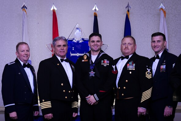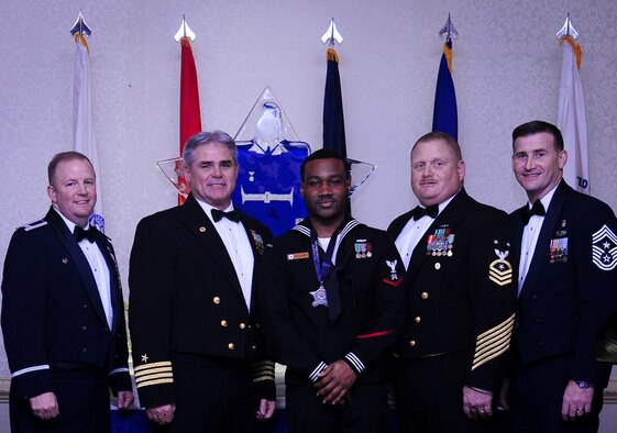 Col. Jeffrey DeVore, Joint Base Charleston commander, Capt. Timothy Sparks, JB Charleston deputy commander, Master Chief Petty Officer Joseph Gardner, Naval Support Activity command master chief and Chief Master Sgt. Mark Bronson, 628th Air Base Wing command chief stand with Logistics Specialist 3rd Class Delmetrius Blanding, NSA, Blue Jacket of the Year, Jan. 23, 2015, at the 2014 628th ABW Annual Awards Banquet at the Charleston Club on Joint Base Charleston, S.C. (U.S. Air Force photo/Airman 1st Class Clayton Cupit)