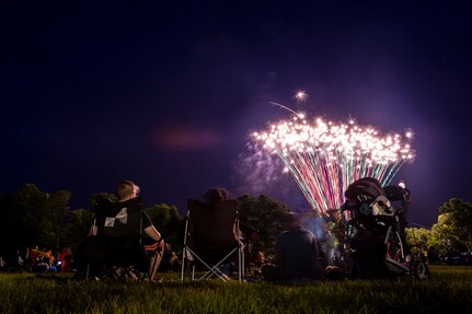 Military members and their families watch the fireworks in the sky, June 28, during the 2013 Freedom Fest at Marrington Plantation at Joint Base Charleston – Weapons Station, S.C. Nearly 1,500 Airmen, Sailors, civilians and their families attended the celebration which included food, drinks, festival rides, music and fireworks. (U.S. Air Force photo/ Senior Airman George Goslin)