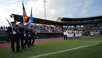 Members of the Joint Base Charleston Honor Guard march onto the Charleston RiverDogs baseball field to present the colors for the military appreciation night opening ceremony Aug. 19, 2010, at Joseph P. Riley, Jr. Park in Charleston, S.C. The RiverDogs and Force Protection, a local manufacturer of mine-resistant vehicles, joined together to recognize military members who've recently returned from deployment. The RiverDogs traditionally host two military appreciation nights a year and offer free tickets to servicemembers and their families. (U.S. Air Force photo/Senior Airman Timothy Taylor)