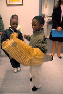 Tyonne Broughton tries on a padded arm protector used to train military working dogs while Ziquan Watson, left, watches before a canine demonstration given by the 437th Security Forces Squadron here Dec. 4. The tour was hosted by the Airman Leadership School and is part of an on going community service project that brings awareness to the opportunities that the Air Force has to offer. Both boys are third grade students from Memminger Elementary School in Charleston. (U.S. Air Force photo/Lauren Laidlaw)