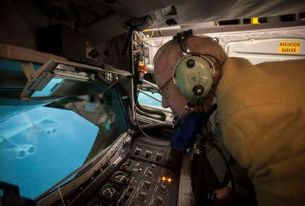 Peter Wertimer, Chernoff – Newman, LLC, Advertising Division president, tries his hand at the KC-135 Stratotanker Boom Operator Weapon System Trainer Nov. 5, 2014, at MacDill Air Force Base, Fla. The BOWST is a fully-simulated, large-scale procedural trainer for aerial refueling with replicated aircraft. (U.S. Air Force photo / Senior Airman Tom Brading)