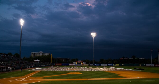 Members of the Joint Base Charleston Honor Guard wait for a rain delay to end during the Charleston RiverDogs Military Appreciation Night game April 25, 2013, at the Joseph P. Riley, Jr. Park in Charleston, S.C. The Charleston RiverDogs hosted Military Appreciation night to show their support for the local military. (U.S. Air Force photo/ Senior Airman George Goslin)