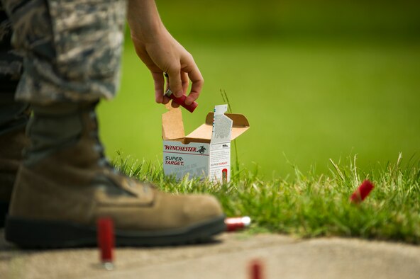 Airman 1st Class Chris Curry, 628th Logistics Readiness Squadron customer service journeyman, grabs shells to reload his shotgun during a skeet and trap shoot at Joint Base Charleston - Air Base, S.C., July 11, 2012. The Airmen participated in a skeet and trap shoot sponsored by the Single Airman Initiative Program, which aims to build camaraderie among Airmen and leadership while increasing communication and understanding. (U.S. Air Force photo by Airman 1st Class George Goslin/Released) (Photo by Airman st Class George GoslinReleased)