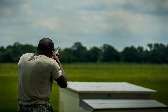 Senior Airman William George, 628th Communications Squadron knowledge operations management journeyman, fires at a clay target during a skeet and trap shoot at Joint Base Charleston - Air Base, S.C., July 11, 2012. The Airmen participated in a skeet and trap shoot sponsored by the Single Airman Initiative Program, which aims to build camaraderie among Airmen and leadership while increasing communication and understanding. (U.S. Air Force photo by Airman 1st Class George Goslin/Released) (Photo by Airman st Class George GoslinReleased)