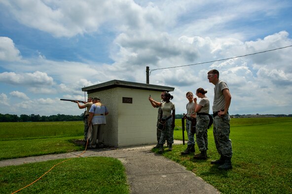 Airmen wait in rotation to fire during a skeet and trap shoot at Joint Base Charleston - Air Base, S.C., July 11, 2012. The Airmen participated in a skeet and trap shoot sponsored by the Single Airman Initiative Program, which aims to build camaraderie among Airmen and leadership while increasing communication and understanding. (U.S. Air Force photo by Airman 1st Class George Goslin/Released) (Photo by Airman st Class George GoslinReleased)