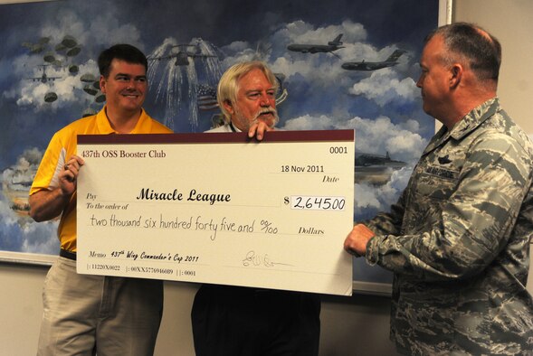 Colonel Erik Hansen presents a check to the Charleston Miracle League Nov.23 for the amount of $2,645 which was raised during the Commander's Cup Golf Tournament at Joint Base Charleston - Air Base. The Charleston Miracle League is a baseball league for special needs children. Hansen is the Commander of the 437th Airlift Wing. (U.S. Air Force photo/Airman 1st Class Ashlee Galloway)