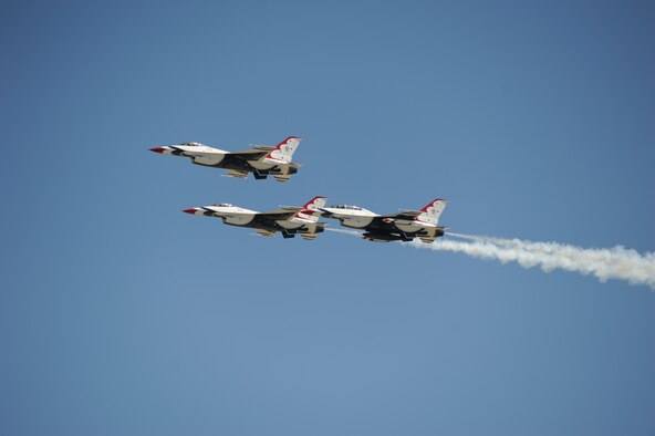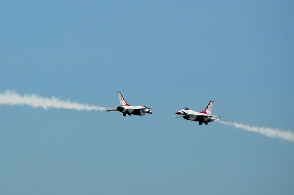 The U.S. Air Force Thunderbirds perform a basic maneuver during a local familiarization flight April 6, at Joint Base Charleston, S.C. In their 58th season of flying, the Thunderbirds were selected to be the highlight of Joint Base Charleston's 2011 Air Expo. (U.S. Air Force photo/Airman 1st Class Ian Hoachlander)