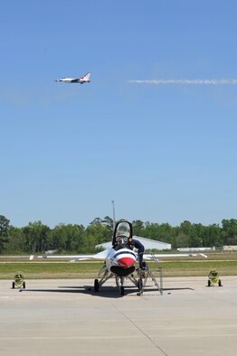 Two U.S. Air Force Thunderbird pilots taxi into their designated spots following a familiarization flight April 6, 2011, at Joint Base Charleston. The team's mission is to exhibit the capabilities of modern, warfighting aircraft and to demonstrate the high degree of skill maintained by Air Force members serving in a variety of career specialties. (U.S. Air Force photo/Airman 1st Class Ian Hoachlander)