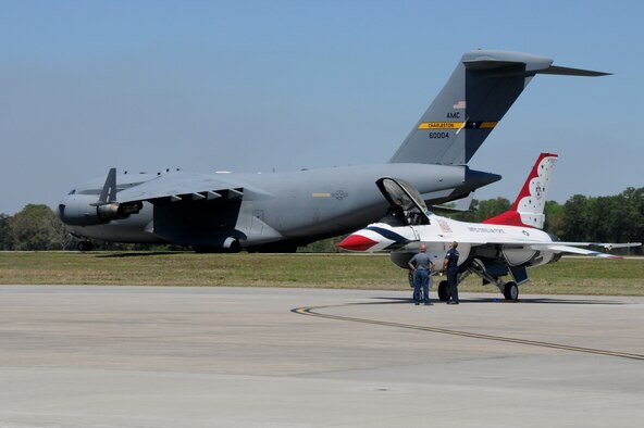 The U.S. Air Force Thunderbirds arrive at Joint Base Charleston, S.C., April 6. The Thunderbirds are scheduled to perform Saturday, April 9 during the 2011 Air Expo along with the U.S. Army Special Operations Black Daggers Jump team, Tora! Tora! Tora!, the GEICO Skytypers, a B-25 Bomber, Air Combat Command demonstration teams and much more.