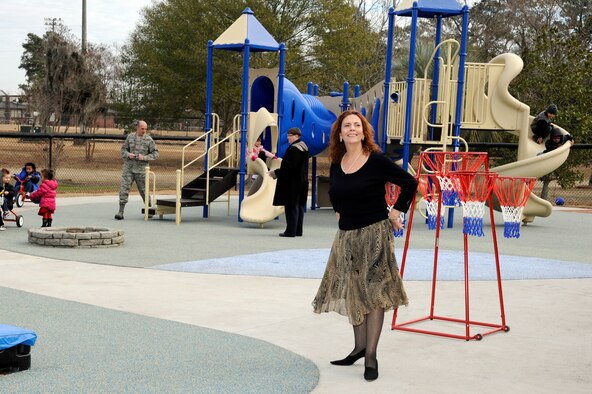 Mrs. Carmen Mikolajcik looks around the playground of the new General Thomas R. Mikolajcik Child Development Center during the rededication ceremony at Joint Base Charleston on Dec. 16, 2010. The new center is able to serve more than 300 children and replaced a 38-year-old facility that could handle about half as many children. Mrs. Mikolajcik is the wife of former General Mikolajcik. (U.S. Air Force photo/Staff Sgt. Marie Brown)