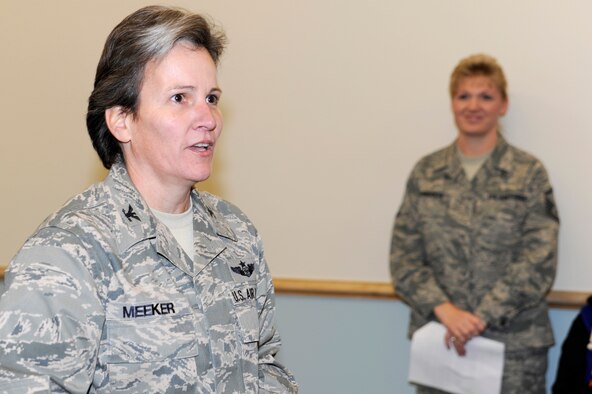 U.S. Air Force Col. Martha Meeker provides remarks during the rededication ceremony of the new General Thomas R. Mikolajcik Child Development Center at Joint Base Charleston on Dec. 16, 2010. The new center is named for Brig. Gen. Thomas Mikolajcik who was the former commander of the 437th Airlift Wing. Colonel Meeker is the 628th Air Base Wing commander. (U.S. Air Force photo/Staff Sgt. Marie Brown)