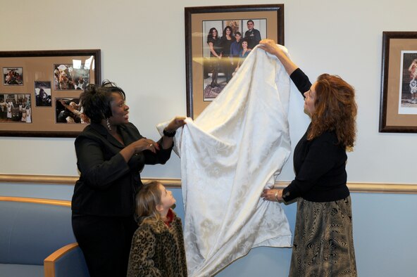 Mrs. Delores Phelps, left, Mrs. Carmen Mikolajcik, right, and Ella Vanderpool, bottom, unveils a Mikolajcik family portrait in the lobby of the new General Thomas R. Mikolajcik Child Development Center during the rededication ceremony at Joint Base Charleston on Dec. 16, 2010. The new center is able to serve more than 300 youngsters and replaced a 38-year-old facility that could handle about half as many children. Mrs. Phelps is the CDC director, Mrs. Mikolajcik is the wife of former General Mikolajcik and Ella is the granddaughter of Carmen. (U.S. Air Force photo/Staff Sgt. Marie Brown)