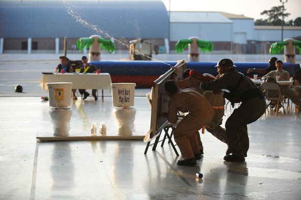 Members of the 437th Airlift Wing engage in a water gun fight during the combat dining out on Joint Base Charleston, S.C., Sept. 17, 2010. Two members provided cover with a folding table while the other took aim against their adversaries on the opposite side of the hangar. (U.S. Air Force photo/James M. Bowman)(Released)