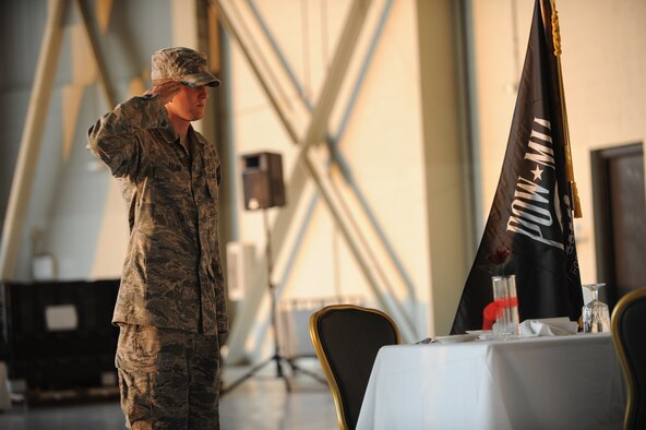 Airman 1st Class Travis Tyler salutes in remembrance at the Prisoner of War/Missing in Action table during the combat dining out on Joint Base Charleston, S.C., Sept. 17, 2010. Places set at the POW/MIA table honored those who could not join the event and were symbolic of the sacrifices made by many in service to their country. Airman Tyler is with the 437th Aircraft Maintenance Squadron (U.S. Air Force photo/James M. Bowman)(Released)