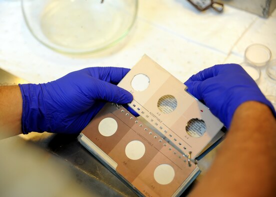 Staff Sgt. Mark Heitkamp prepares a fuel sample form to annotate the days tests on July 20, 2010 on Joint Base Charleston, S.C. Information noted from the days tests will then be transferred to their database for storing and reference. The fuel being tested is JP-8, a colorless sustance composed of a large number of chemicals that smells of kerosene. Sergeant Heitkamp is the noncommisioned office in charge of the fuels laboratory with the 628th Logistics Readiness Squadron. (U.S. Air Force photo/Senior Airman Timothy Taylor)