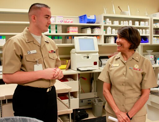 Hospitalman Dalton Terrell, pharmacy technician, Naval Health Clinic Charleston, describes the daily operations of and services provided at NHCC's pharmacy, for Rear Adm. Raquel Bono, chief, Navy Medical Corps and director, National Capital Region Medical Directorate , Aug. 21, 2015 during Bono's visit to NHCC. Bono also met with NHCC command leadership, visited various departments throughout the clinic, and spoke with staff members about the future of Navy medicine and what's on the horizon for military health care through the collaboration of joint service operations. (Navy photo/ Hospitalman Mark Simon)